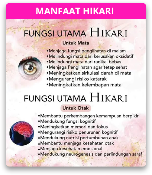 Hikari diformulasikan khusus untuk membantu menjaga kesehatan mata dan otak, serta mendukung fungsi fokus dan daya ingat. Aman dikonsumsi segala usia, terutama anak-anak dan lansia, dengan nutrisi organik yang berkualitas.